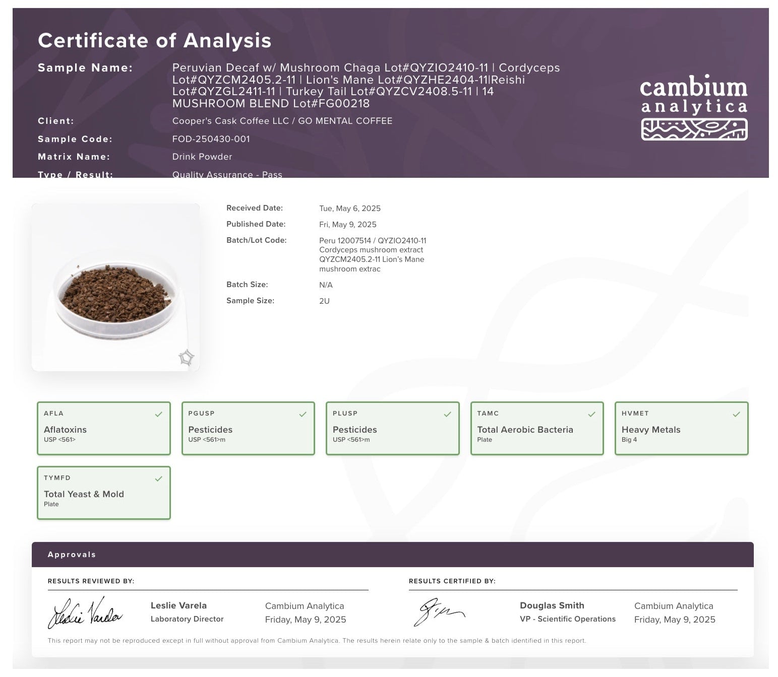 Current LOT Composited Testing (Mushrooms & Mushroom Blend + Organic Decaf Coffee - PASS-View Results